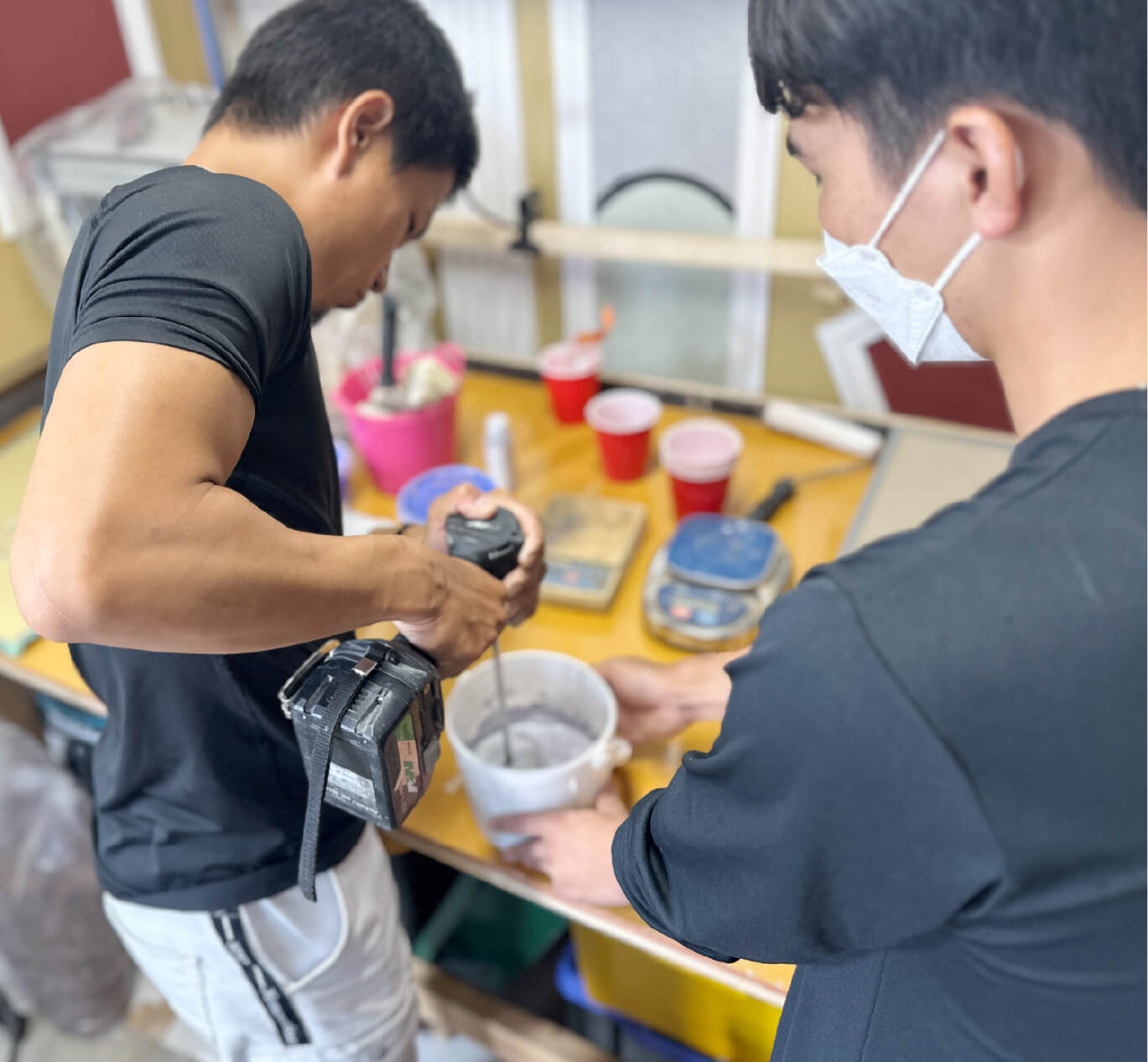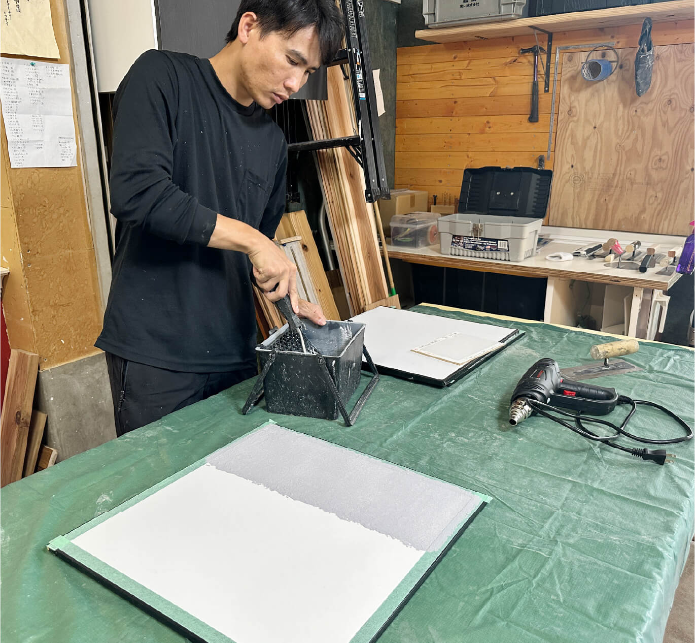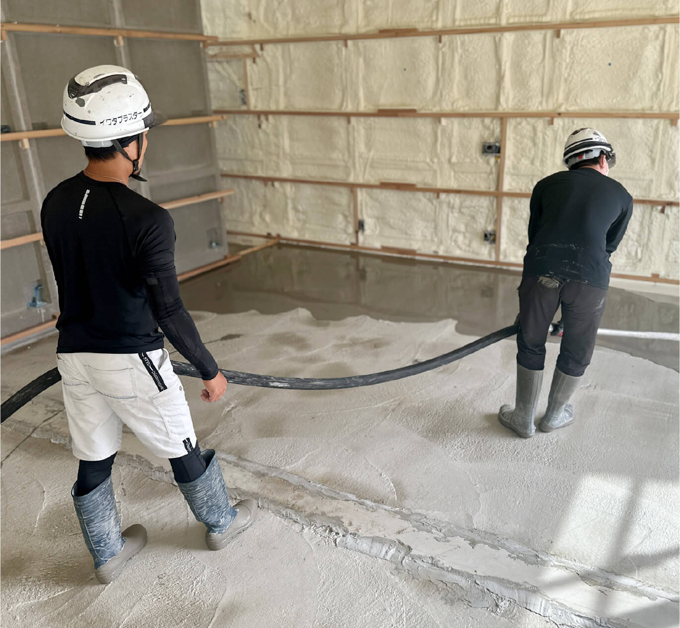 有限会社イワタプラスターでは、早い段階から実際の作業に挑戦して技術を磨ける環境です。作業前・作業後の清掃や、床などが汚れないようにビニールやテープで覆う「養生」の作業からコテを持って壁を塗る作業まで職人さんと一緒に行って、仕事の流れを覚えていただきます。失敗を恐れず左官工事の楽しさや難しさをどんどん体験して行きましょう!